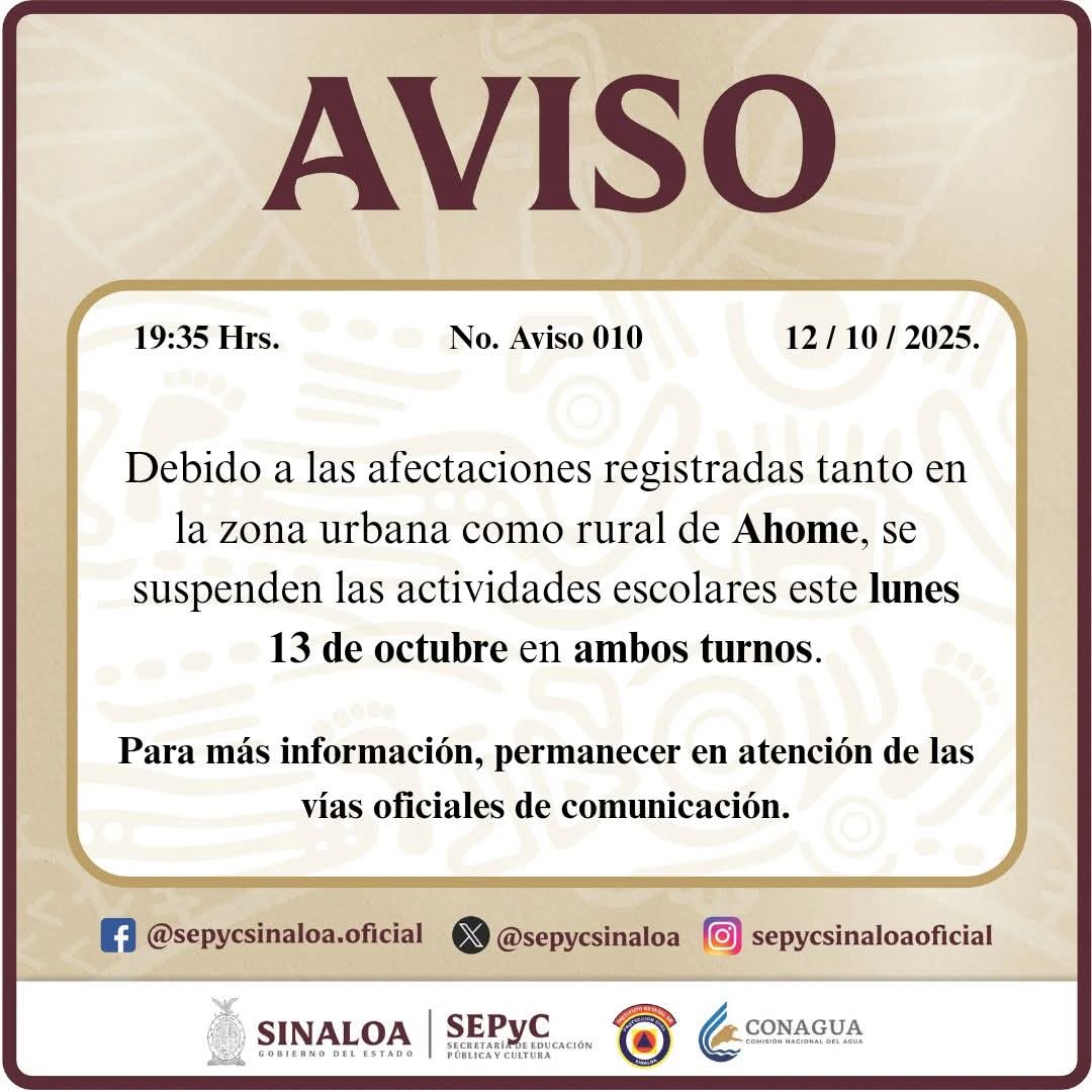 La Secretaría de Educación Pública y Cultura de Sinaloa (SEPYC) decidió suspender las clases este lunes en el municipio de Ahome, por las afectaciones que dejó la lluvia.