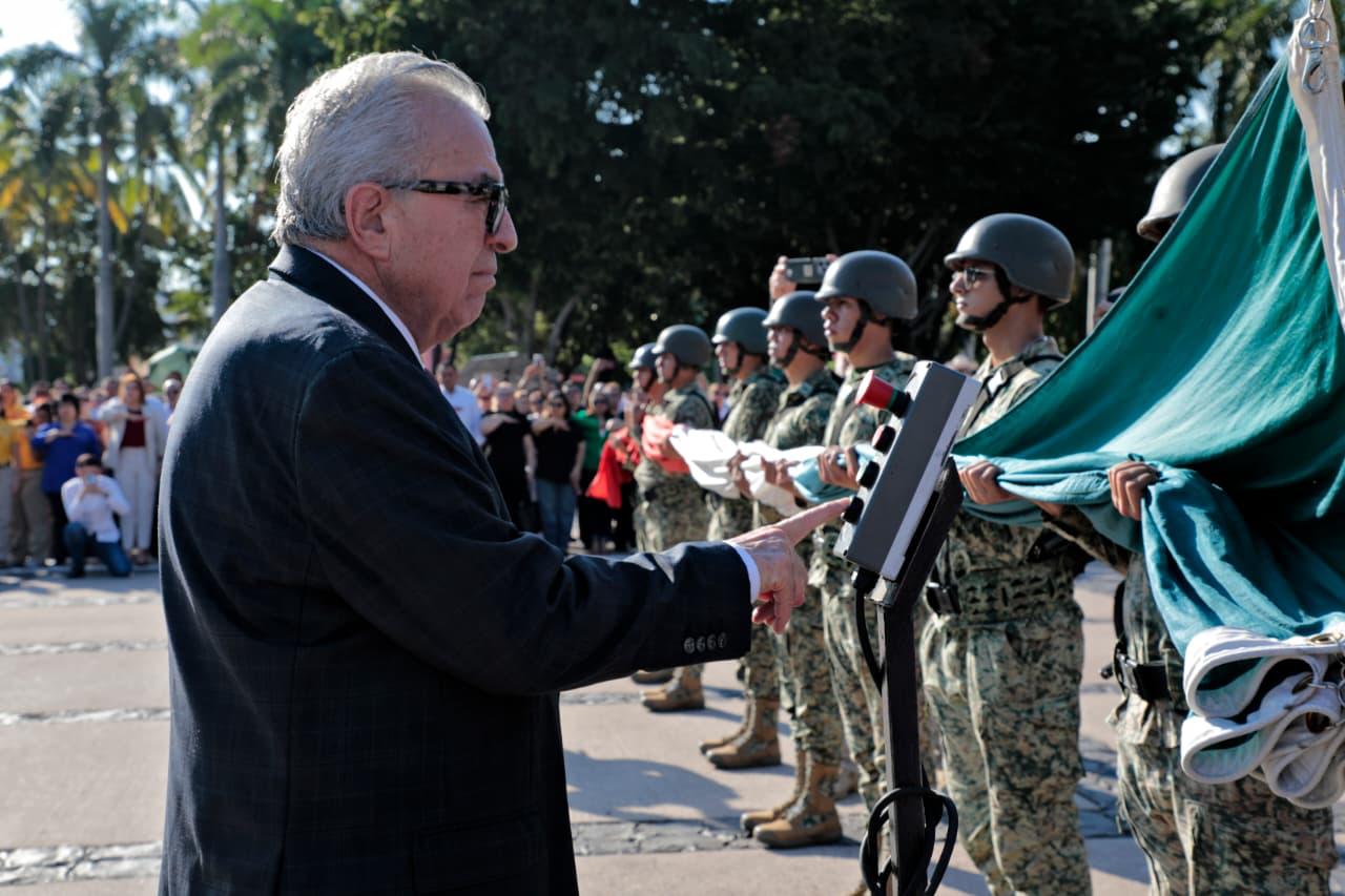 El gobernador Rubén Rocha Moya, acompañado de autoridades civiles y militares presidieron el acto conmemorativo al 142 aniversario del nacimiento del Gral. Ángel Flores y aniversario de los caídos en la lucha de la democracia de la plaza de las Tres Culturas, en Tlatelolco, con el izamiento de bandera a media hasta y honores de ordenanza en la plaza cívica de Palacio de Gobierno.